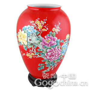 中国红瓷手绘花开富贵莲子缸