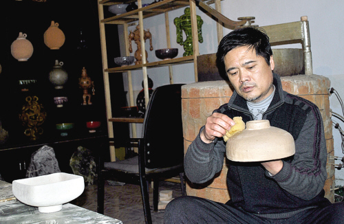 如今,沉寂十余年的海城陶瓷工艺被列为市级非物质文化遗产,与一个名叫韩宇的人不无关系,他是该工艺的唯一代表性传承人。记者见到韩宇时,他还在那个不足20平方米的小屋里研制陶器:一个靠在墙面上的陈列柜,一张床,一个窑,一地未完成的陶艺胚。这些年,韩宇就是这样坚持研究发展海城陶瓷工艺的。韩宇的父亲曾是海城陶瓷四厂的技术科科长兼美术师,他从小就对陶瓷有着莫名的亲切感。1980年,18岁的韩宇也进了陶瓷厂,凭着天分,韩宇在产品设计车间里一干就是17年,直到1997年下岗。之后两年多的时间里,韩宇换了好多工作,可始终对制陶不死心。韩宇偶然在电视上看到一个叫邢良坤的大连人,虽然是钳工出身,但竟然在陶瓷工艺上获得二十几项国际发明专利,一百多个国家的博物馆收藏其作品,而且邢良坤“撂下狠话”:谁能搞出我这东西,我的家产全都给他!这个在韩宇眼中“挺傲”的人形容自己的作品“前无古人,后无来者”,这激起了韩宇的觉醒,“一个门外汉都成为了行业内的大师,我怎能轻易放弃!”