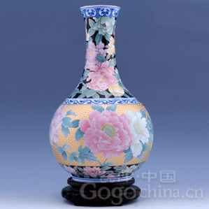 袁述凡大师手绘·釉下五彩富贵东方描金玉壶春瓶