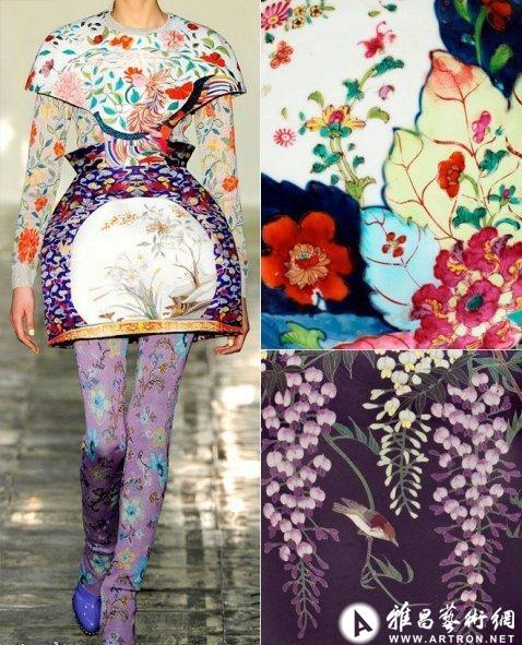 时装设计对于陶瓷元素的运用,不仅仅是瓷器的图片,很多时装造型也以古代陶瓷器型为主,加之模特的曲线美,让青花瓷完美绽放。最近,ary Katrantzou2011秋冬更是将中国瓷器搬上伦敦秀场,满场飞动的乾隆斗彩及瓷胎绘珐琅器灵感印花图案,瓷瓶造型的钟型裙,满眼的龙纹图案让中国元素在伦敦的秀场上大放异彩!斗彩的雍容华贵与镂空技巧,与时尚的完美结合,给观众一场奢华的视觉享受。