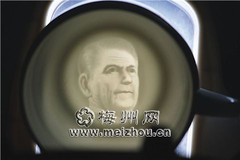 一只精致小巧的杯子,对着光线或装上水后观察杯底,能清晰瞥见一个前美国总统里根的肖像显影而出,构造如此独到,设计尤为精妙,令人叫绝!这是1999年,由梅江区的收藏爱好者凌志平先生于福建泉州购得的。