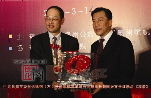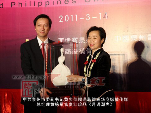 活动中,徐钢书记作了热情洋溢的致辞,他表示泉州与菲律宾交往源远流长,此次开展的“中国·泉州文化周”活动,也是希望以文化为纽带,增进泉州与菲律宾侨亲的交流。同时,徐钢书记还向华商纵横传媒总经理黄栋星,泉州公会理事长戴国兴等菲律宾商界、政坛精英人士赠送了来自福建省富贵红文化发展有限公司的“富贵红”陶瓷工艺品《月语潮声》、《和谐》。