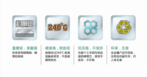 咋一看这个浴室柜好像是实木材质,其实它是金属材料。用作航空领域的蜂窝钢、蜂窝铝打造而成,全金属材料使整体重量减轻,而且可回收利用,更环保耐用。