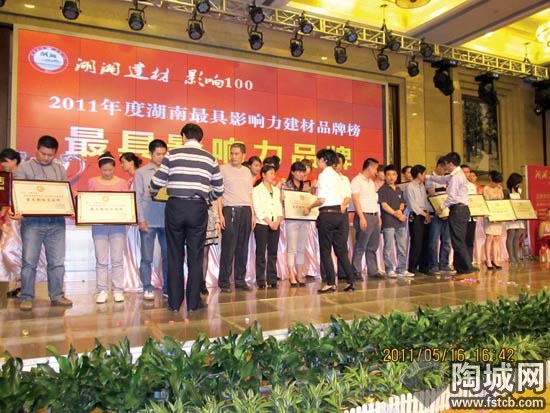 5月16日,由湖南日报报业集团、长沙市工商联、长沙市质量技术监督局主办,由长沙市装饰建材商会(简称“商会”)、三湘都市报承办的“湖湘建材 影响100”2011首届湖南最具影响力建材品牌榜的发榜典礼在长沙华雅商务大酒店圆满落幕,同时长沙市装饰建材商会2010-2011年度年会成功举办。长沙市工商联主席彭继球、三湘华声联合编委会总编辑张云梦,长沙质量检验所重要领导、湖南不动产商会会长喻春光博士,全国工商联家具装饰业商会秘书长谢鑫、商会会长周海军及长沙建材各大建材品牌经销商共300多人出席了会议。会议由长沙装饰建材商会执行秘书长阳凌主持。
