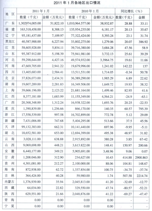 2011年1月各地区出口情况