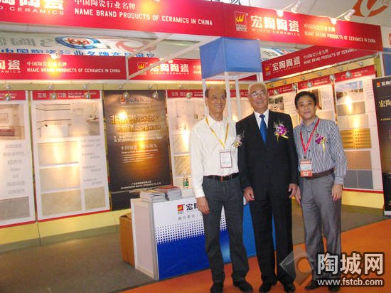 中国陶瓷工业协会理事长何天雄(中)亲临宏陶陶瓷展位参观指导