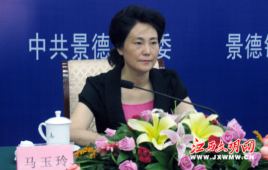 景德镇市委常委、宣传部长马玉玲现场介绍此次陶瓷精品布展情况。