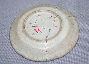 宋代哥窑青釉葵瓣口盘底部损后