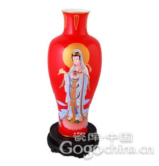 图:观音神像如意红瓷观音花瓶