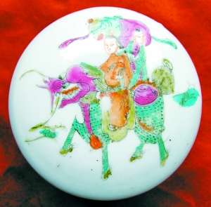 清代的粉盒多为当时大户人家的妇女常用之物,一般多以陶瓷为主,也有用玉及金银、料器、竹木等所制,图案上也常以人物、动物、花鸟等为题材。这件粉盒上所绘麒麟送子图案具有一定的生活文化气息,在清代器物中属于较常见的一种。