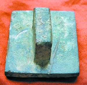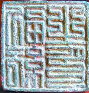 陈女士带来的这方青铜印章很是引人注目,经鉴定,这是一方金代的官印,印文为九叠篆书阳文“副统之印”,印面为正方形,橛钮,通高4.08厘米,印台厚1.23厘米,边长6.4厘米,重481.9克。钮旁阴刻有“副统之印”文字。钮顶部刻一 “上”字。