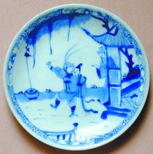这件青花戏曲人物纹盘口径11.63厘米,底径6.5厘米,内壁绘有青花戏曲人物三个,画工飘逸自然,青花色泽清丽淡雅。周围绘有楼台、山水、草木等。外底素胎无釉,无款识。一般了解青花瓷的藏友都知道,明代晚期青花瓷的特点是色彩相对淡雅,人物也画得自然飘逸。而且明末清初时期,文学艺术繁荣,不仅为瓷器纹样提供了丰富的创作题材,而且还深刻影响着瓷器装饰画面的艺术表现手法,这与明代万历以来带有版画的戏曲剧本的大量流行有关。民窑瓷器上的许多人物画中除了常见的婴戏图、八仙祝寿图外,表现戏曲故事也特别盛行,《三国演义》、《西厢记》、《水浒传》等作品中的内容比比皆是。这也正好符合这件青花瓷盘的特点。