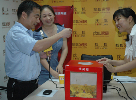 【彭经理】:各位网友大家好,我是冠珠陶瓷广东大区经理彭经理,很荣幸今天能借助搜狐的网络平台与各位消费者和网友们一起见证此次抽奖活动。冠珠陶瓷是新明珠集团旗下的知名陶瓷品牌,在19年的成长历程中逐步被行业认可,更受到了越来越多消费者的喜爱与支持。为答谢广大消费者,冠珠陶瓷携手全国经销商开展感恩促销活动,7月30日至8月1日活动在广西火热进行,大家可以看看这就是活动当天店里的促销现场,非常火爆,仅3天广西的成交量就达两千多户。活动中惊喜不断:有进店送礼、新品买三送一等为消费者实实在在省钱的促销内容,其中一项就是今天即将在这里进行的钻戒抽奖活动。今天的抽奖仪式将现场抽出5名钻戒中奖者。只要你参与了我们的活动,就有机会得到一张抽奖券,各地经销商再将抽奖券快递到佛山冠珠陶瓷总部。