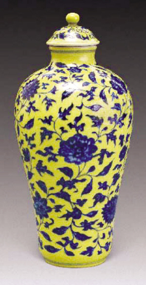 黄釉彩瓷在此时期也有了较高水平的发展,特别是仿明弘治的黄釉青花花果盘、柠檬黄釉青花瓷器、鸡油黄釉绿彩器和少量的黄釉粉彩器。这些器物虽然数量不多,但是极具收藏价值,在每次拍卖中都有不俗的表现。