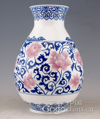 图:瓷器礼品·手绘青花釉下五彩缠枝牡丹精品花瓶