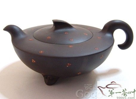 而在紫砂壶装饰中有一项装饰很特殊的,就是在紫砂茶壶上包裹一层锡皮,称锡包或砂胎包锡,这种风格曾在清代道光年间有过短暂时间的流行。现在我们所能见到的最早的包锡紫砂壶为朱石méi所制。朱石méi是清嘉庆、道光年间人,有人说他“将紫砂与锡、玉工艺相结合,别开紫砂工艺的生面”。为什么要在紫砂壶上包裹一层金属?起因应该是当收藏者所喜爱的或有收藏品价值的茶壶有所破损时,为了弥补和挽救所作的相应方法。当口面开了缝时就在口上包一条线,壶嘴断了用玉石代为包接,身筒开裂则来个全身包锡等,以至后来有专施包接金属的装饰方法,如“锡包础方壶”、“包锡罩壶”等。还有一种金属包裹的情况,即1 9世纪初宜兴紫砂壶因外销泰国、马来西亚等南洋诸国的市场需要而为。泰国华人富商钟爱包金、包铜、包唇口双沿、盖钮和壶底的圆珠鼎足及流口,均为黄金镶嵌的“镶金圆壶”(水平壶),和抛光壶身筒面,在口沿、底沿、盖边、嘴流镶嵌铜皮的“独钮洋桶壶”等,这种情况与以上所说自然不可同日而语。
