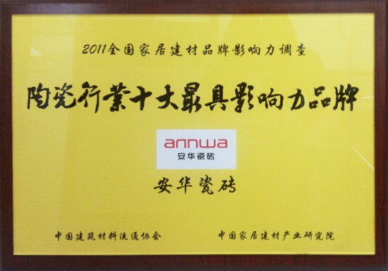 2011年8月7日,由中国建筑材料流通协会、中国家具产业研究院共同举办的“2011全国家居建材品牌影响力TOP榜单”颁奖典礼,于中国人民大会堂隆重举行。安华陶瓷以其精湛的工艺技术、自然灵动的设计风格、丰富的产品线赢取了超高的票选支持率,从1200多家参选企业中脱颖而出,一举夺得“陶瓷行业十大最具影响力品牌”盛誉。