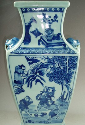 乾隆《桃花源记》青花方尊正是体现了对这种意境的追求。此方尊采用平口、曲颈、端肩、修腹、端足、狮首衔环的优美造型,营造了可供艺术创作的八个层面。当我们随着渔夫的小船经过小溪,穿过洞石,豁然开朗地显现出一群人在桑树竹林间,远离深山外的战火略杀正在神情愉快地拿出自家的酒菜招待远到而来的客人。在瓶颈部的博古书卷八宝纹饰的配合下,让人不知不觉地走进了令人神往的世外桃园的意境中......