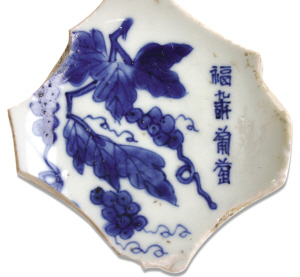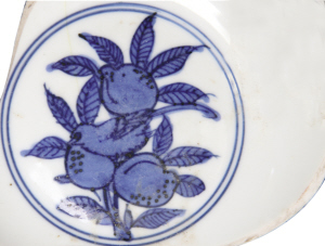石榴。石榴花是繁荣昌盛、和睦团结的喜庆佳兆;果为多子多孙、多福多寿的祥瑞象征,在明中、晚期青花瓷上为多见。画面上一株石榴,浆果破皮而出,寓意“榴开百子”。榴、桃、佛手同绘,为多子、多寿、多福。
