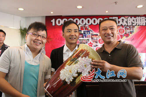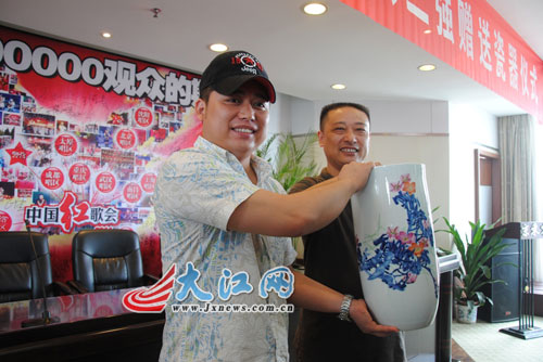为了充分诠释作品所体现的红歌精神,余欣还先后两次登上井冈山写生,最后选定玉兰瓶作为器型,采用纯手工制成,胎体釉料精选细腻,由下向上渐渐扩展,意为积极向上发展。当看到红歌三甲捧着纪念品时,余欣非常激动,他表示自己终于与红歌结缘了。