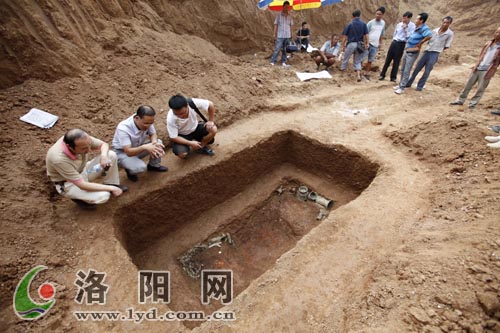 29日下午,记者随市文物工作队工作人员一起来到该墓葬的发掘现场:瀍河回族区唐寺门附近的洛阳荣康医院新址建设工地,墓葬位于该工地的东南方向,几名工作人员正在对墓葬进行清理。我们看到,该墓葬距地面约7米,坐北朝南,长约3.2米,宽约1.6米;墓葬形制为西周时期比较常见的竖穴土坑墓,墓室中部略低于墓底,有一腰坑。由于年代久远,墓内的棺材已经碳化,只在墓室周围留下黑色的痕迹。从痕迹分布情况看,棺材呈梯形,北部宽1米、南部宽1.2米,长约2.4米;放置在棺材内的墓主人尸骨已经碳化,只在墓室底部留下一些红色的碳化痕迹,仔细辨认,能大致看到人形模样。在墓室的北部,靠近墓主人头部的地方,放置着几件保存完好的青铜器,分别为一爵、一鼎、一簋、一觚、一戈,另外还有一件陶鬲,但已经破碎。尤其值得一提的是,工作人员在簋的底部还发现有至少五个字的铭文。