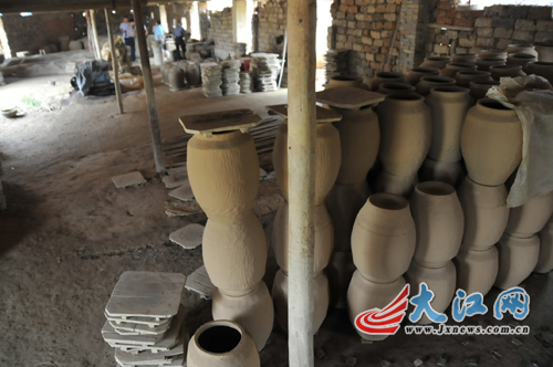 在作坊内,记者看到72岁的江瑞仁正在制作陶器的毛坯。他在泥粉里倒上水,拌成泥团,之后取出一块搓成条状,沿陶底粘好、捏扁。绕粘了几圈后,一件形似水管的陶皿雏形完成。江瑞仁告诉记者,他年轻时,在丰城学手工制陶技艺的人很多,由于销量好,丰城还专门办了陶厂。可随着金属、玻璃和塑料器皿的出现,用土陶的人越来越少,厂子最终倒闭。不过,仍有一部分人,愿意用这种古拙的陶器作为盛酒盛油的容器,因此,古法制陶作坊徘徊在摇摇欲坠的边缘。