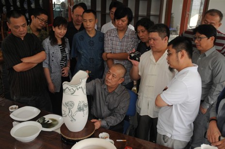 为了给众多艺术家一个展示艺术理想的新舞台,济南园博园专门建立了陶瓷原创基地,名为“毓窑”。策展人魏庆立介绍:众多艺术家沉浸毓窑,潜心创作参展作品,并不仅仅停留在以瓷为纸的层次,而是挖掘运用瓷器本身的语言结合水墨经验完成作品,展示思想,形成交流。下图为山东艺术学院张志民院长在毓窑现场创作。