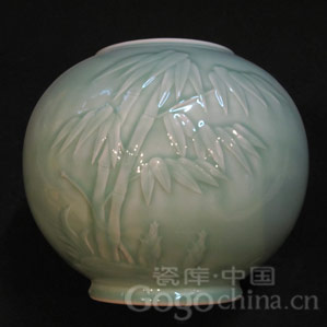 图:龙泉青瓷弟窑梅子青竹报平安天球瓶