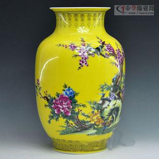 图:帝王黄瓷粉彩富贵花香高档花瓶