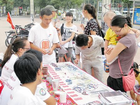 昨日,在义卖现场,市民购买瓷器献爱心。 昨日上午,来自江西景德镇陶瓷学院的13名大学生骑着自行车跋涉一千多公里来到西安,在文化新天地广场打着“悠悠瓷韵扬古今、千里骑行忆汉唐”的标语,举行爱心义卖活动,引得路人纷纷驻足奉献爱心。再过两天,他们将赶赴西宁,将所得爱心义卖款全部捐给那里的留守儿童。
