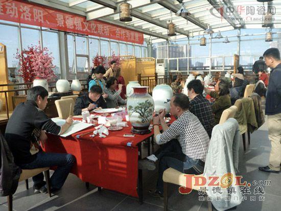 与洛阳书画家同场作画现场交流,是这次采风活动的重头戏。当天下午,洛阳的书画家、收藏家、企业家、记者纷纷前来观摩景德镇陶瓷艺术家现场绘制瓷画。