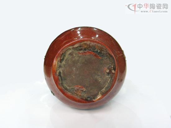 图2-1宋代荣昌沥彩壶是成都玉垒山房的藏品,它是荣昌早期的紫砂类陶器作品。我们知道,江苏宜兴用紫砂泥制陶始于宋代,最早有确切年代的器物,就是南京中华门外马家山油坊桥明嘉靖司礼太监吴经墓出土的紫砂提梁壶,墓志标明入葬于嘉靖十二年,即公元1533年。这把荣昌泥制沥彩壶的器形,具有明显的五代至北宋时期的巴蜀古陶瓷特征,它是荣昌陶器具有千年历史的物证。它的胎体由红泥制作,它肩部两侧的花卉图纹用白泥浆沥彩而成,花簇繁茂而灵动。它是一把执壶的同时,又是一件难得的艺术作品,这表明荣昌陶器的制作者从一开始就追求艺术性与实用性的结合。图2-2是它的底部,从图中可以看出其平底略呈下凹状,底的这种形态一直延续到近代,可以说平底下凹是荣昌陶器的一个特征。图3-1、图3-2的贴刻花素烧壶为晚清作品,其盖为后配。它素胎无釉,跟宜兴紫砂相似,其两侧有贴刻的梅花,美观大方。图4-1、图4-2的朱砂釉胆瓶是典型的清代器物,釉面光亮多变化,含蓄而生动。图5-1、图5-2是件清代月白釉绿彩水盂,属文房用具,文房类是荣昌安富镇陶器的一大门类。由于荣昌陶泥质地细腻,可塑性强,烧结变形小,非常适合制作小巧玲珑的薄胎器物,因此有“泥精”之称。在这件水盂的月白色乳浊釉中饰条与点状釉下绿彩,看上去大有唐代邛窑遗风,不免引起研究者对巴蜀陶瓷文化的万千思绪。图6-1、图6-2的清代鸟食罐白色胎,外饰乳浊月白釉,内饰绿釉,加上火石红,呈现三种色彩。从唐代到民国,巴蜀古陶瓷鸟食罐甚多,这跟自然条件下的民俗文化有关。图7是一对清至民国的尖底鸟食罐,素胎有白泥贴花。用红白二泥互为装饰,也是荣昌安富镇陶器常用的装饰手法。图8是清至民国时期的红丹釉倒流壶,所饰之釉鲜红光亮,如南红宝石一般。倒流壶又叫倒注壶、倒灌壶、倒装壶、内管壶等,这一充满科技与趣味的品种在古代陶瓷中是比较稀少的。这件作品呈桃形,又是喜庆的红色,真是件不错的祝寿礼品。图9是件清至民国的龙纹穿带扁壶,它应是一个便于携带的酒壶。虽然它属于粗陶类品种,但是那只经沥、贴、刻、划而成的从天而降的黄龙,是多么地刚毅有力,真是一件大写意佳作。