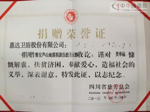 2008年汶川大地震,唐山惠达卫浴第一时间捐款100万;2009年惠达卫浴总经理王彦庆亲自前往四川灾区考察灾后重建工程;2010年4月14日,青海玉树发生7.1级地震,4月15日,惠达卫浴向中国红十字基金会捐款50万元支援玉树;4月15日,惠达卫浴在北京举行义卖,将义卖产品所得款项全部捐赠我国西南旱区;4月29日,惠达卫浴捐赠侨联援建北川中学捐赠仪式在绵阳举行,惠达卫浴捐赠价值100万元的洁具产品帮助北川中学重建……一笔笔捐赠,一次次善举,惠达卫浴正以他们的行动来回报整个社会。同样经历过灾难,同样接受过别人的帮助,惠达卫浴清楚的了解每一次公益行动背后的真正意义。对于惠达卫浴来说,公益事业是一条永远没有终点的道路,而他们也将用自己的努力在这条道路上阔步前行!