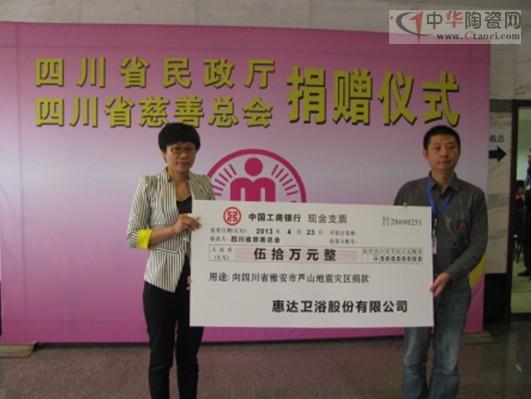 四川雅安芦山发生7.0级地震后,国内最大卫浴企业惠达卫浴在第一时间宣布向灾区捐款50万元,用于采购救灾物资,全力帮助灾区人民早日重建家园。