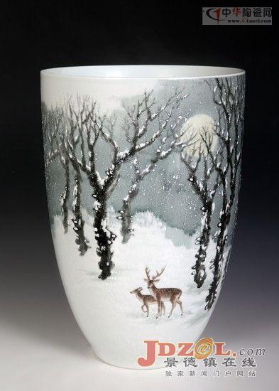 欧阳敏作品 粉彩瓷瓶《雪霁鹿鸣》