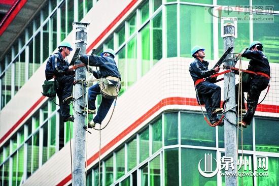 昨日清晨,电力工作人员已开始施工。两根12.5米高电线杆上,六名施工人员穿着“脚扣”在紧张施工。德化有1000多家陶瓷企业,几乎都用上电窑炉,而安装公用配电变压器,是为服务小型陶瓷企业。