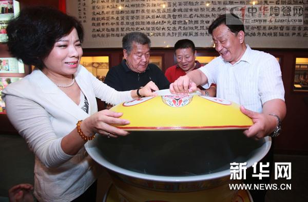 6月30日,在北京老舍茶馆创始人尹盛喜先生逝世十周年纪念茶会上,老舍茶馆联手景德镇陶瓷工艺大师制作的巨型盖碗亮相。此碗以老舍茶馆经典黄盖碗为原型,制作历时1年,用陶土烧制,高75厘米,直径88厘米。