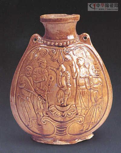 这件黄釉扁壶,其皮囊式造型与胡腾舞的图像,强烈再现了千余年前西域游牧民族的文化特色。这种扁壶在河南洛阳、孟津北朝墓中也有出土,且形制和图案相近,这是对中原与西域音乐文化交流最为直观形象的诠解,说明中原汉民族对于外来文化一直秉承兼收并蓄的文化态度,同时也为研究北朝时期的胡汉民族关系、南北朝时期的陶瓷工艺发展以及我国乐舞发展提供了珍贵的实物资料。