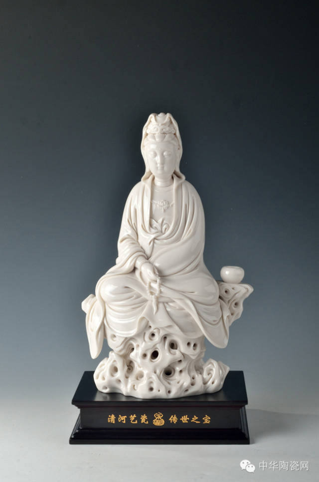 福建省工艺美术大师 苏友德作品--11英寸坐岩链珠观音,手刻签名