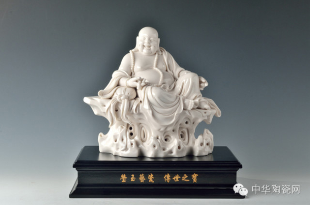 福建省工艺美术大师 苏友德作品--9英寸坐岩戏鱼弥勒,手刻签名