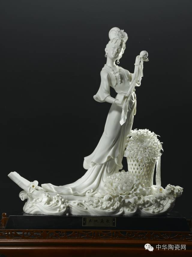 悠悠漓江水载着美丽的刘三姐和绽放的菊花与牡丹花,白瓷釉色洁白凝厚,温润雅致,把刘三姐塑造得更加清秀俊逸、超凡脱俗。踏着竹排在漓江上漂流的“刘三姐”手持绣球欲向情歌抛去……这广西特有的动人风情画面,就是德化“中国白”瓷雕《大地飞歌·刘三姐》所定格的精彩一幕。在2008年10月份开幕的第五届中国——东盟博览会上,作品被作为国礼赠送给东盟各国领导人,2010年泉州霞洲妈祖宫赴台湾台南大天后宫祭奠之时,德化瓷塑作品《大地飞歌》被作为礼品赠送给国民党主席马英九。