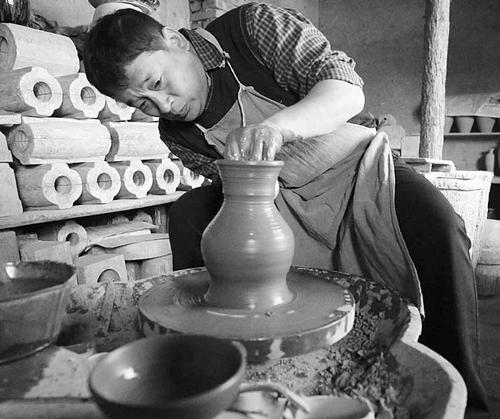 3月21日,阳泉平定张文亮刻花瓷文化有限公司车间内,国家级非物质文化遗产保护项目 “平定黑釉刻花瓷制作工艺”代表性传承人张文亮在制作黑釉刻花陶瓷产品。