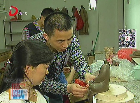 【同期声:陶知然艺术研究所所长:张明贵:我是想用新的一种材质,又不能摒弃我们德化传统的技艺方法,所以就采用宜兴紫砂土,再结合德化的传统雕塑这样制作而成,跟市场有个差异化。】