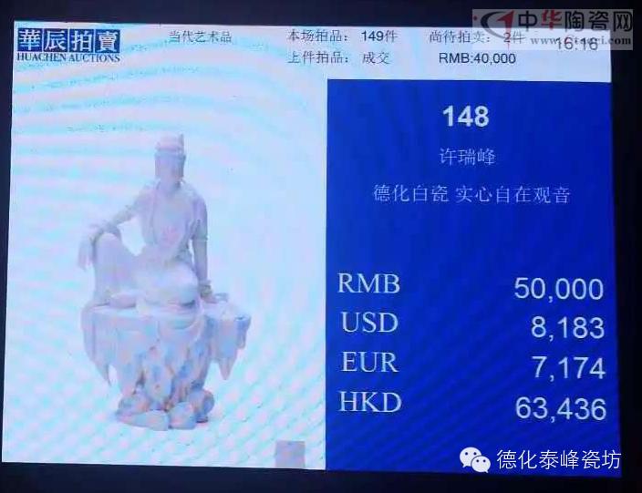 由福建艺盛文化策划组织,德化百年瓷艺世家许氏第六代传人、当代艺术家许瑞峰的个人艺术作品首次走进国内大型拍卖公司厦门华辰春季拍卖会。6月20日,厦门华辰春季拍卖会圆满落幕,拍出藏品总成交金额五千多万元。