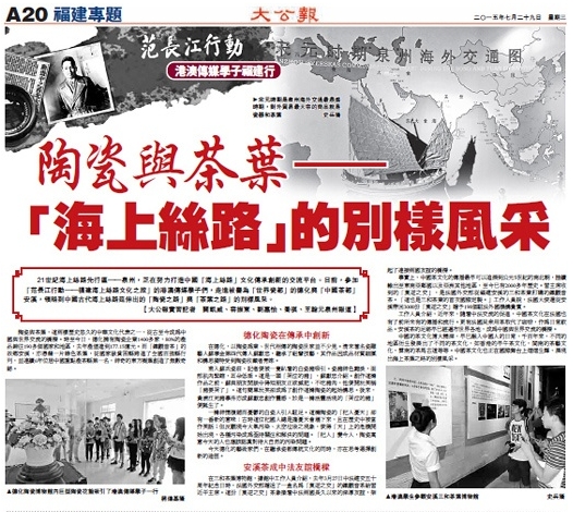 21世纪海上丝路先行区——泉州,正在努力打造中国“海上丝路”文化传承创新的交流平台。日前,参加“范长江行动——福建海上丝路文化之旅”的港澳传媒学子们,走进被誉为“世界瓷都”的德化与“中国茶都”安溪,领略到中国古代海上丝路延伸出的“陶瓷之路”与“茶叶之路”的别样风采。(大公报实习记者关凯威、容振东、刘嘉怡、乔祺、王翰元泉州报道)