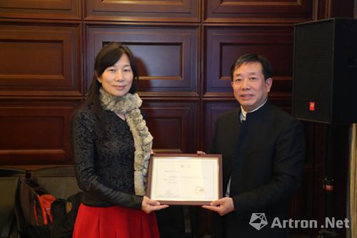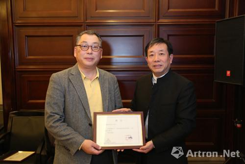 河南博物院院长田凯为台湾中华陶艺协会荣誉理事长苏正立(左)颁发展览专家聘任证书。