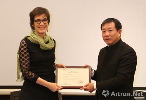 河南博物院院长田凯为策展人温蒂女士颁发聘任证书。
