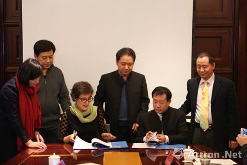 河南博物院院长田凯与温蒂女士签署“首届中原陶瓷双年展”策展协议。
