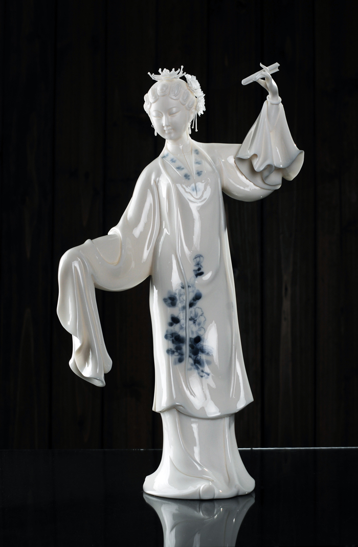 作品简介:作品以中国传统戏曲为创作题材,将传统的文化赋予新的艺术形式,凝结中国戏曲、陶瓷、绘画三大文化元素于一体。突出德化白瓷陶瓷的材质美感与青花的国画艺术特征、戏剧的唯美浪漫风格。