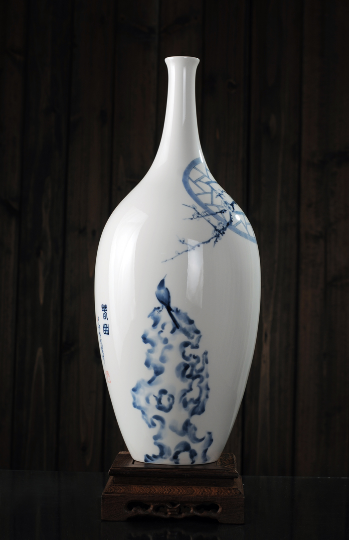 作品简介:此瓶是邱玫瑰代表作之一,其器型优美,小口,细颈,丰肩,鼓腹。作品用料考究,温润如玉的“中国白”,瓶上青花图案继承传统瓷器含蓄内敛风格,给人以简明的快感。